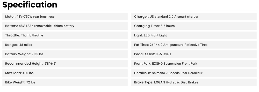 The removable waterproof battery makes it possible to ride in any weather, and the fat tires make it easy to control the bike on loose terrains and even on snow.