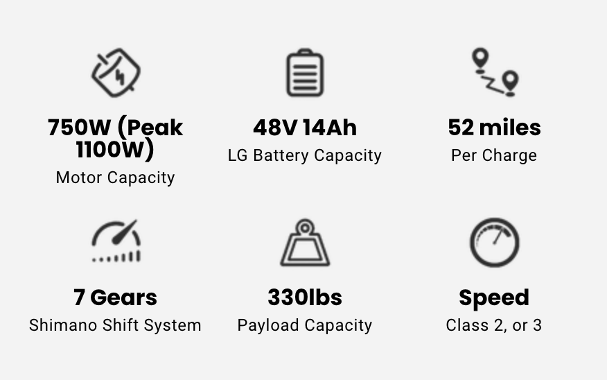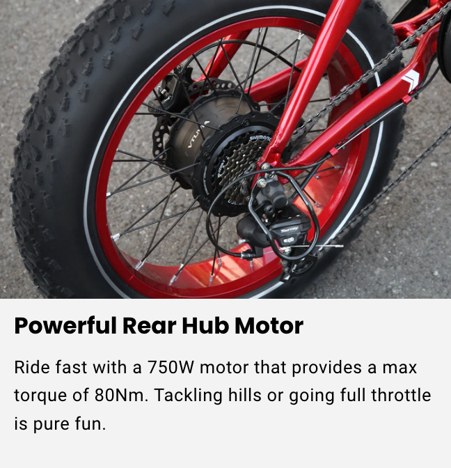 The VTUVIA SX20 is designed with a low stand over height (15.4'') and an aesthetically pleasing folding frame, making it accessible to a wide range of riders. The bike is equipped with a 750 watt brushless rear hub motor and an LG 14ah battery, providing a powerful and long-range ride that ensures you can comfortably make your way home.